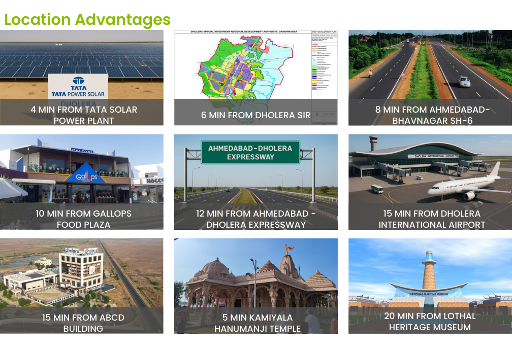 Strategically located near Dholera Smart City, India’s first planned greenfield smart city, this project benefits from massive government-backed infrastructure development, industrial corridors, and upcoming global connectivity. Dholera is rapidly emerging as Gujarat’s next major investment hub, attracting domestic and international interest across manufacturing, logistics, and residential sectors.
